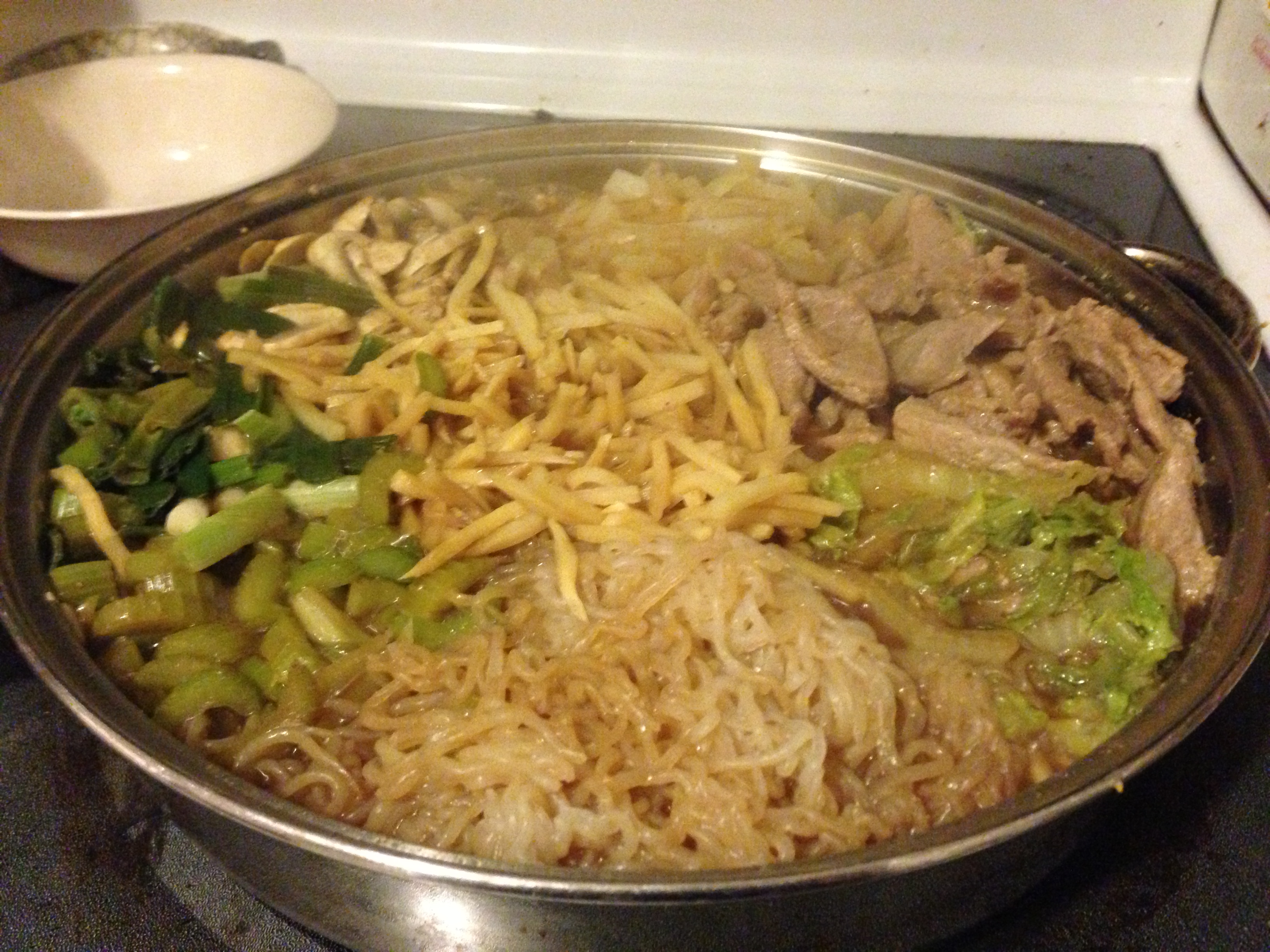 Move the pan off the heat while you arrange the rest of the ingredients in the pan. Move the onions and garlic to a corner of the skillet. Pile them as compactly as possible with the top of the pile almost level with the top of the pan, and then put the meat in next to the onions. Add other vegetables, going around the skillet and keeping each separate. I usually save the bamboo for the last and I put in in the center.