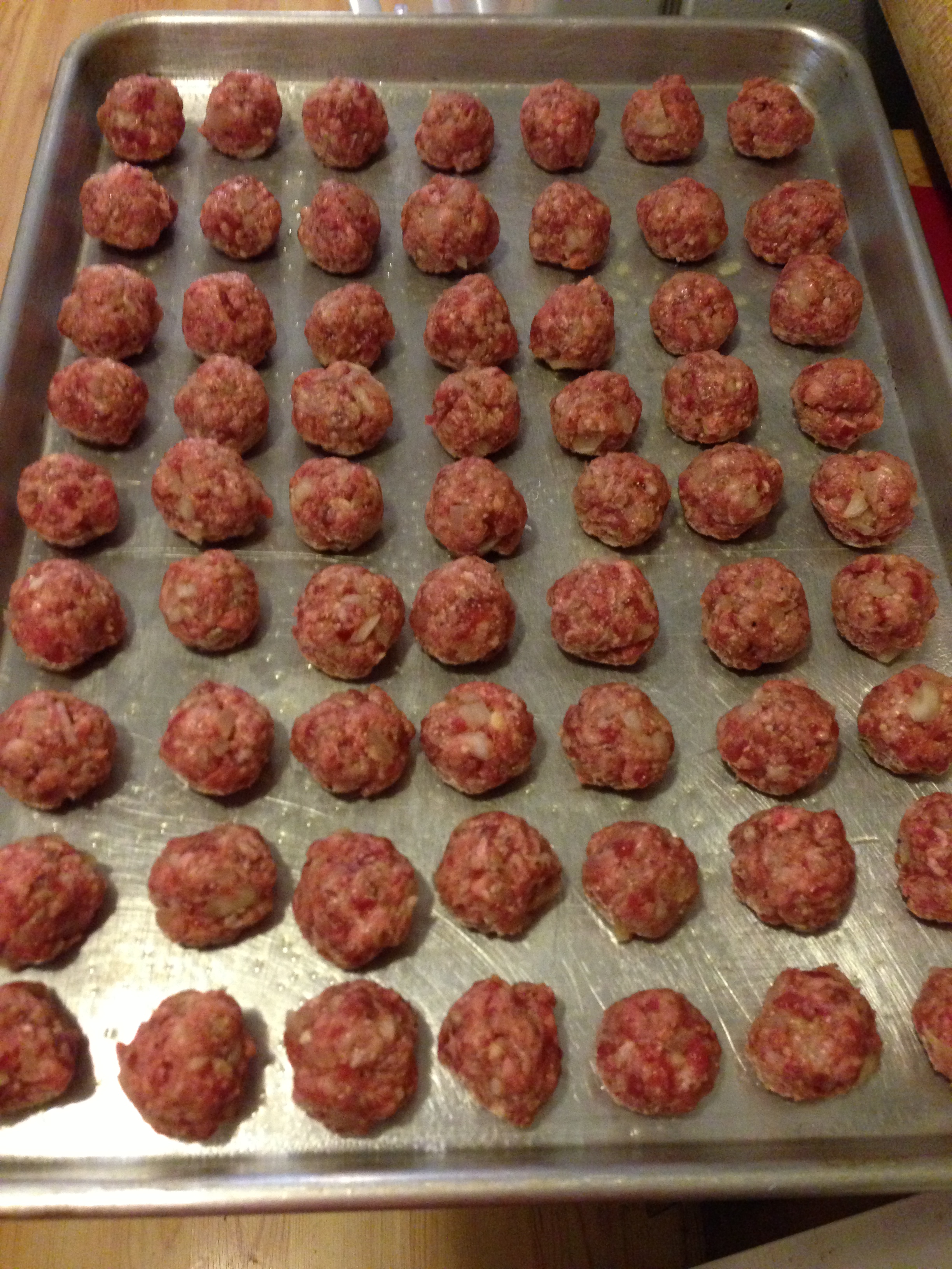 In a bowl, combine all the meatball ingredients. Using your hands, smoosh everything together until it is it well mixed, and then roll out small meatballs between your palms and place them on the baking sheet. Try to get them a uniform size so that they will bake evenly. I made mine about the size of a shooter marble and came out with 63 total, which made for a nice 9 x 7 grid of meatballs.
