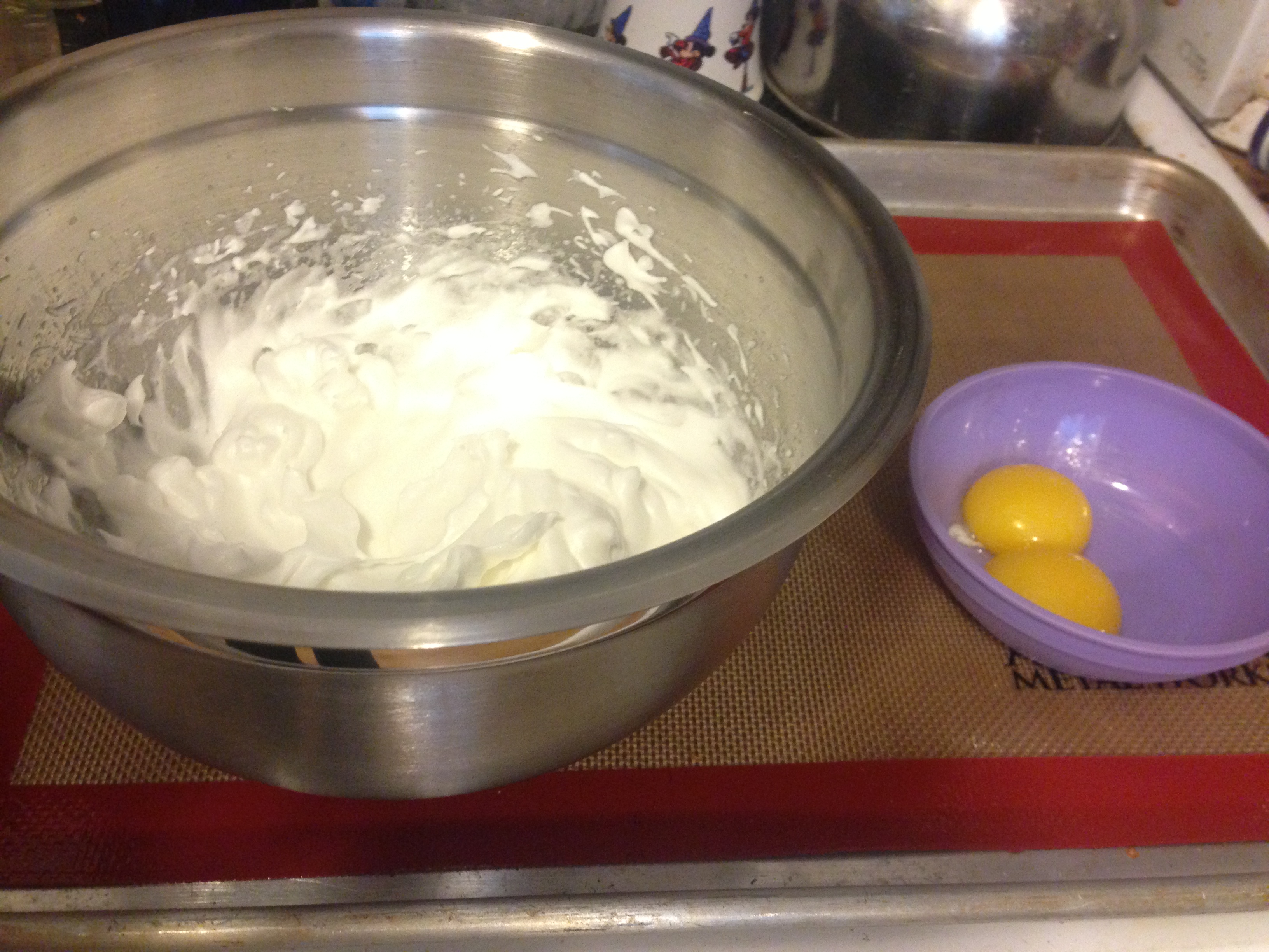 Separate the eggs, setting the yolks aside and putting the whites into a glass or metal bowl. The egg police won’t come after you if you use a plastic bowl, but it must be very clean for the eggs to whip properly and plastic tends to hold onto oily residue where metal and glass don’t.