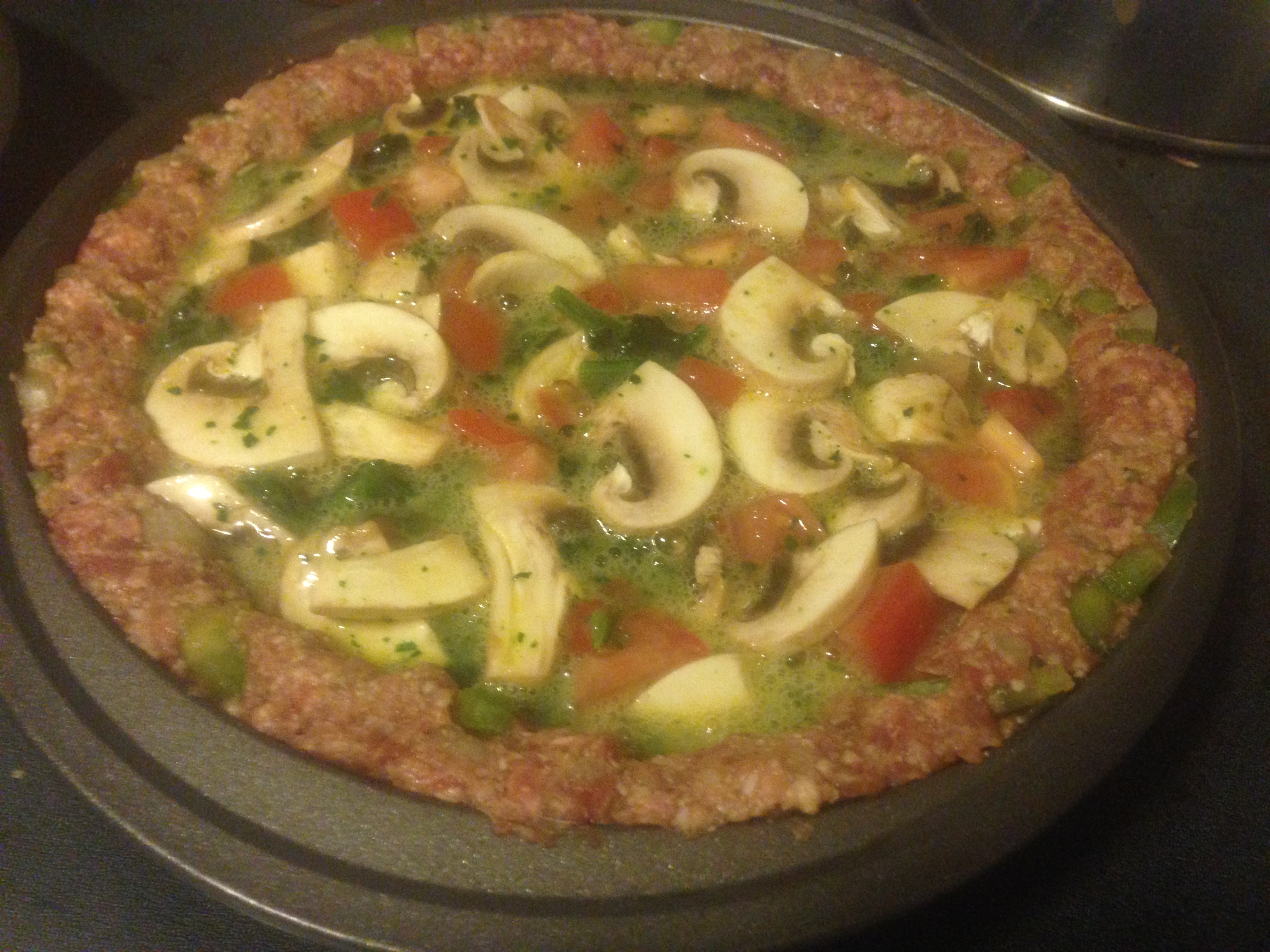 This savory pie has a meat crust, using a modified meatball recipe, pressed into a deep dish, filled with Roma tomatoes, mushrooms, and eggs and topped with melted cheese. I normally make it for dinner, but it would be great for breakfast, brunch, lunch, dinner, or any kind of meal I’ve left out. It would even work for elevenses.