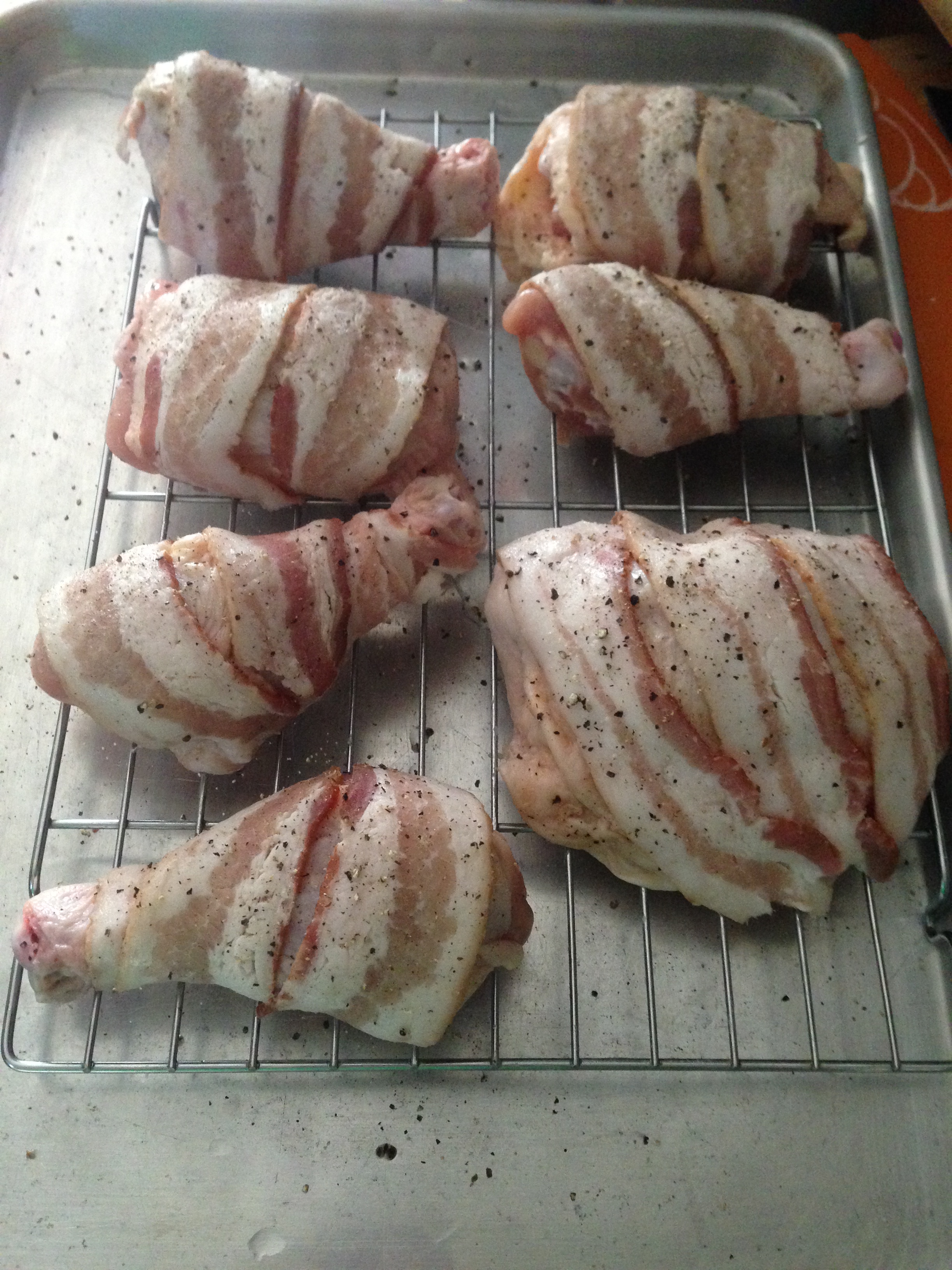 Place a wire cooling rack on a baking sheet, and place the bacon-wrapped chicken on the rack, spacing the pieces out evenly.