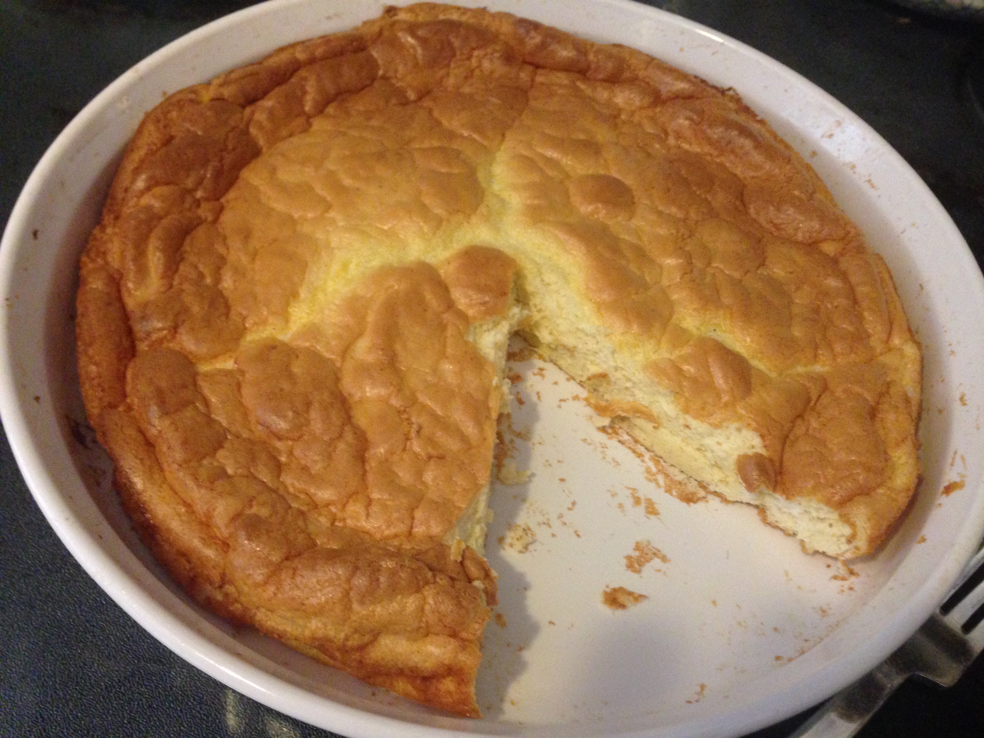 Pour the batter into the prepared baking dish, smooth it out evenly, and bake for 30 minutes at 350º. It will puff up a lot while baking. When it’s done, let it cool for a few minutes until it deflates back down. Cut into slices and serve with the topping of your choice.