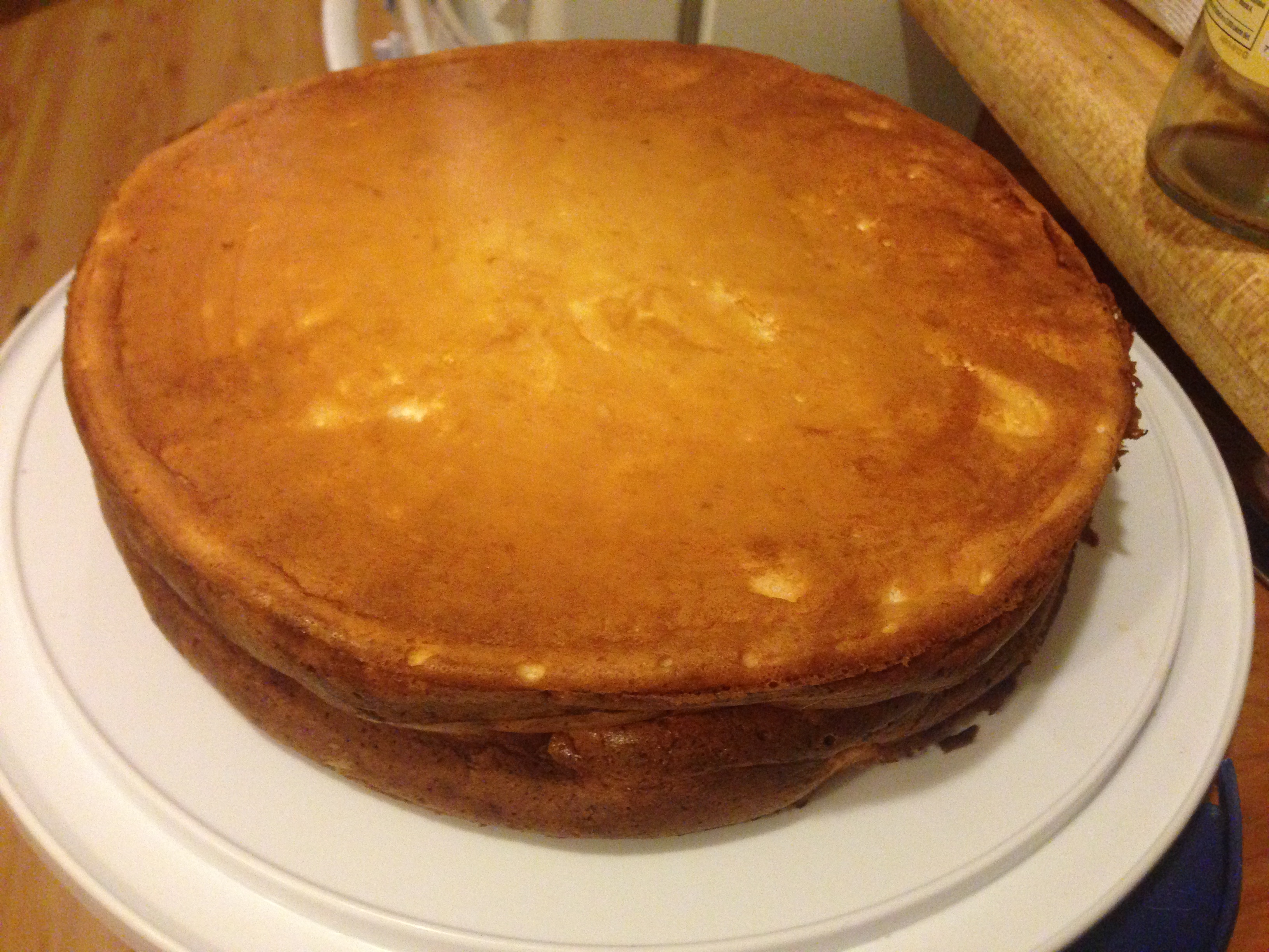 Allow the cakes to cool completely in the pans. The cakes will puff up hugely while baking, but they’ll deflate once they cool, leaving a flat surface with a slightly raised lip around the circumference, leaving just the right sized space for filling.