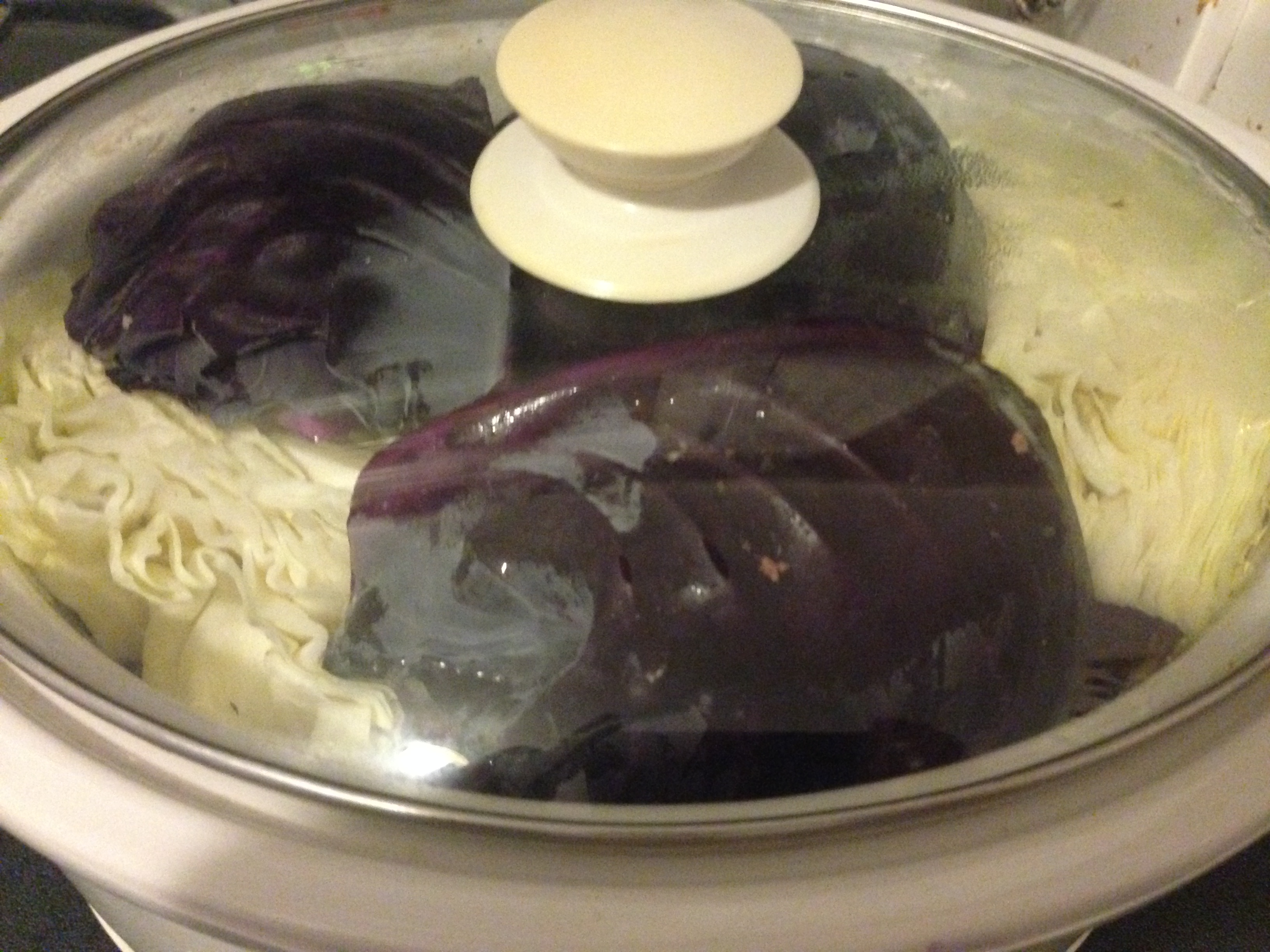 Put as much cabbage as you can on top of the ribs. Depending on how everything fits, you may not be able get an entire head of cabbage in there and still get the lid on. It’s not a big deal. In the photo, I got 1/4 of a large head of green cabbage and an small head of purple cabbage.