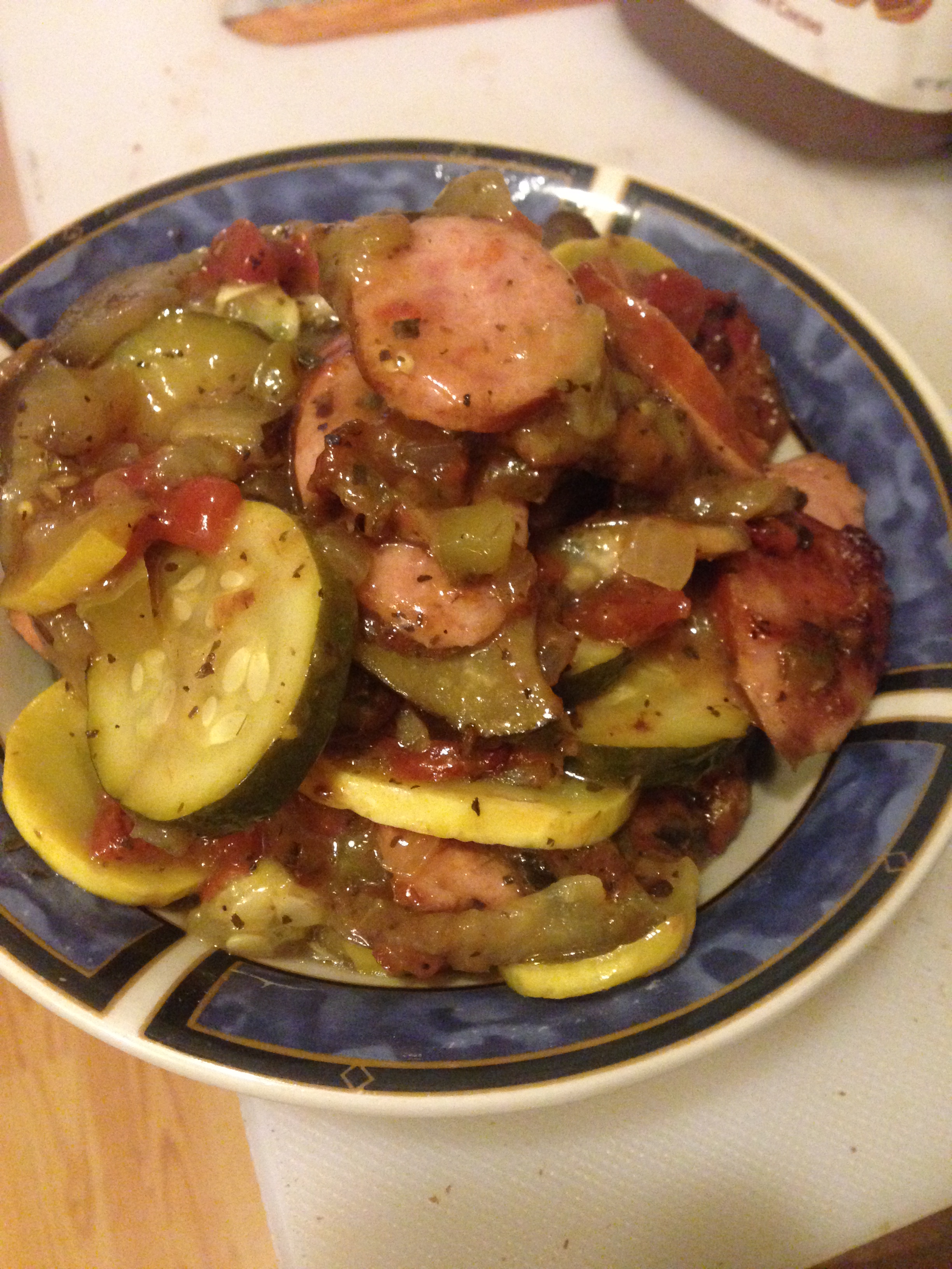 It turns out that ratatouille is several squashes and garden vegetables baked or stewed together with herbs and then given name that is long and hard to spell. Since I prefer not to stand over the stove, my version is baked. My version also includes sausage, because I want it to.